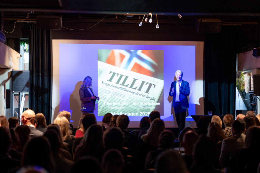 Trine Eilertsen (Aftenposten) og Erik Stephansen (Nettavisen) tok publikum med bak kulissene i norsk journalistikk og belyste hvorfor redaktørstyrte medier spiller en avgjørende rolle i å bygge tillit og felles virkelighet i et fragmentert medielandskap.
